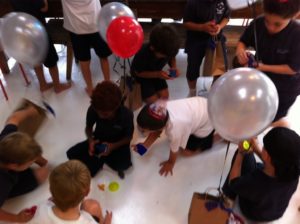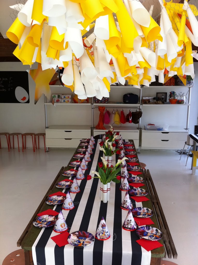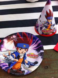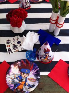 Oh my goodness! Beyblade! One of our repeat BDay party mommies called and said her son wanted a Beyblade party. Knowing that we don’t do cheesy — and that we would give it a COOP spin — she left us to do our thing! We wanted to stay away form the branded goodies (we really gag at the teeny tiny cheesy plastic stuff that most party stores sell!) — so we did our own interpretation on the theme. As we normally do with the branded parties — we did have the branded plates, napkins, hats, and balloons — but we don’t do the plastic table covers. We used our blue and white material table runners, and did a combo of cool modern red and white flowers to add a little punch. We COOP-ed up the gift with blue sweatbands and headbands and fingerless white gloves – just like the actual character wears – and did some tattoos (branded) and a super cool LED spinning top for everyone. The boys were so excited with their gifts — they basically suited up in their gear and started an impromptu spinning top Beyblade battle right on the floor after cupcakes. I love when the kids are so happy with the gift!
