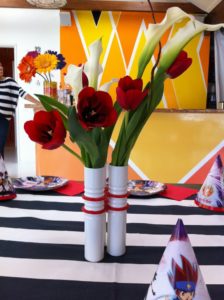 I had a woman in the other day who was a party planner… she was going through our party book and was quite impressed with our flowers. She kept pointing out pictures in the book “Did you do this arrangement?” “Yes.”, “How bout this one?” “yep”, “Do you guys do all these flowers yourselves” “We sure do!” On top of all the actual party planning we do — we spend a great deal of time at the Flower Mart! To be quite honest — I really love it. I LOVE getting down there super early in the morning and loading up on fresh beautiful flowers for the COOP — for my house — for a party — for whatever. I just love flowers. My mom was big into them — she was ALWAY more concerned with how her parties LOOKED than what people ate (I have totally inherited that trait from her!). So anyway — this woman was asking if I would do flowers for her events. OF COURSE! We are always looking at ways to expand the biz — and a little flower arranging or party decor for your at home events is absolutely something we would consider. The pics above are from a party I did at my house — just to give you an idea of the kinds of things we can do for a more “sophisticated” crowd (read: not 5 year olds!!) And, of course and as always, we can ALWAYS add fresh beautiful flowers to your event at the COOP! Just let us know and we will customize something special for your party!