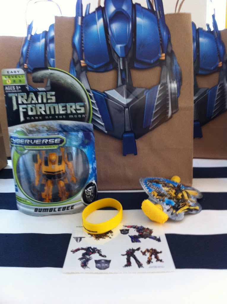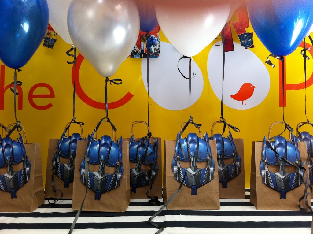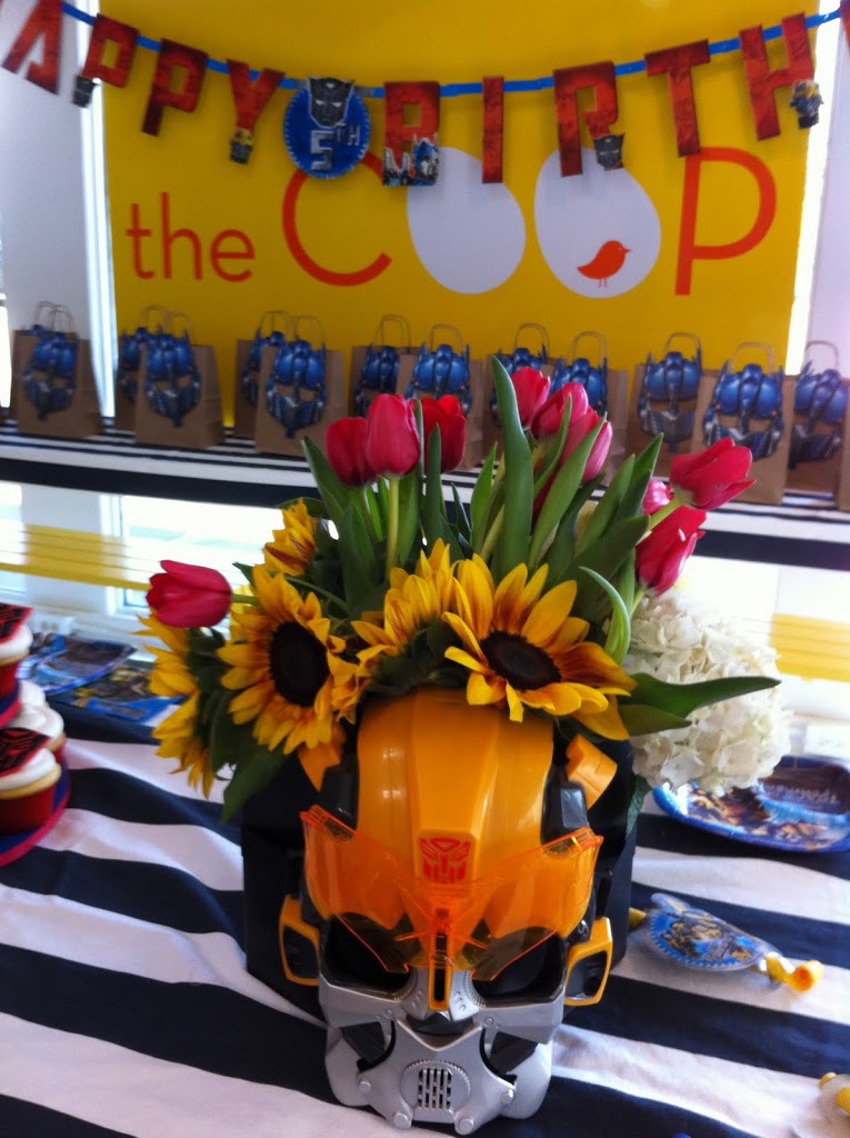 Are you ready for a testosterone fest? Well– we’ve got a TRANSFORMERS party just for you! I was really happy with how this party turned out. The goody bags with the Transformers masks lining the back table really set the stage — and the main table with the floral arrangements wrapped in Transformer masks made for a chic — but still cool enough for a 5 year old boy — look! The cake was a great centerpiece … and all the kids were more than thrilled with their take home treat — a transformer mask, blowout, Tattoos, a rubber bracelet — and an ACTUAL Transformer! Home run! Like always — we kept clear of plastic branded tablecloths — and just used the branded plates, napkins and balloons (my oh my were those Transformer balloons BIG… they were the biggest Mylar balloons I have ever seen!) Super Fun, super fab… super COOP!