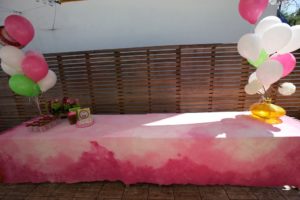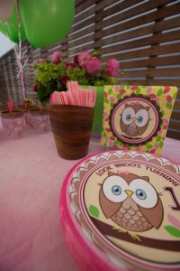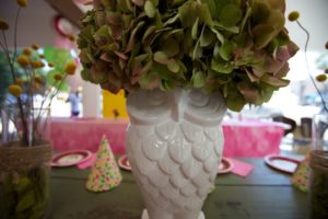 Oh my! I was so excited when this mom came in and wanted to do an owl party… I have the MOST FAB Owl vase at home that I have been dying to use at the COOP — and here was my opportunity! Mom actually bought the gifts and the plates on her own for this one (how cute are the goody bags? She got them on etsy. Adorable!). She just asked me to help with the decor elements and flowers. I think it ended up looking SPECTACULAR! The Owl vase was so perfect! I loved how the hydrangeas made him look like he had an afro! So Darling! I also did lots of smaller arrangements — billy balls, and lots of pink and green flowers to match her party goods. The table cloths outside and on the back table– how freaking fantastic are those things!! I hand dip dyed those ombre pink masterpieces for a party at my house — and thought they would be great for this party. They were! Julie also did a spectacular (as usual) Owl treat table with wood pedestals and little nests of macaroons… so gorgeous and delicious! I just LOVED this party. Love love loved — makes me wish a had a little girl! But I guess that’s why I have the COOP — so I can pink overload on other peoples parties!!!
