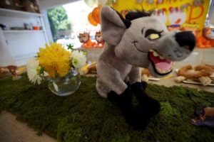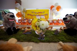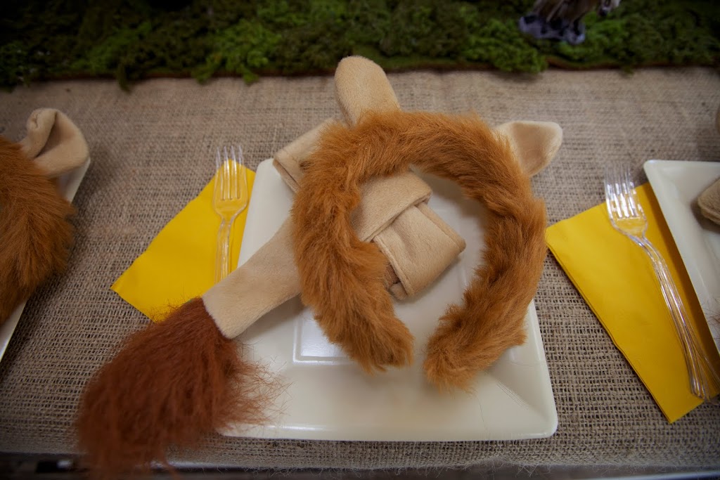 We had a wonderful little guy who had a LION KING party this weekend…. emphasis on the Hyaenas! He LOVES the scary hyaenas. More power to him, I say — but it did make for a bit of a task when it came to designing the party. You see — I think Disney AVOIDS the scary characters when doing their party supplies!!! So we had to improvise. I think we did a pretty great job actually. Lucinda ordered those funny little inflatable lions, that we topped off with crowns (they are KINGS after all!) as well as the great looking stuffed Hyaenas that we placed center stage on the table. I went with burlap table covers — and our mossy grass runners which we placed lots of small figurines on (they went in the goody bags as well). At each setting was a lion tail and ears which are just adorable (Lucy’s doing again!)… and the front room was capped off with my fabulous Lion painting (that I did for a safari party)…. which we placed a crown on as well. So cute. I also convinced my local Subway manager to sell me ALL of his Hyaena Subway reusable lunch bags that we used as the goody bags — to really seal the deal that this was a Hyaena party — not JUST a lion King party! The mom really couldn’t believe the lengths we went to to give her little guy exactly what he wanted for his party. She was ALMOST as happy as the birthday boy himself!