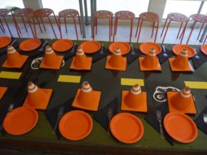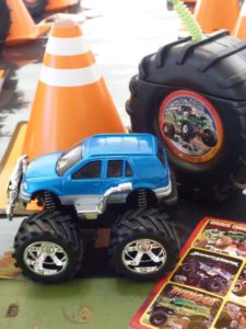 Another one for the boys…. I had someone in today asking about this party….so here are the pictures! Again — we made the table runners out of black wrapping paper that I added the yellow hash marks to, and then had laminated, to make a cool “road” runner. The hats are construction cones — which are so cute on the kids! And everyone get a super cool monster truck, some stickers and an awesome tire shaped sippy cup as their goodie to go.