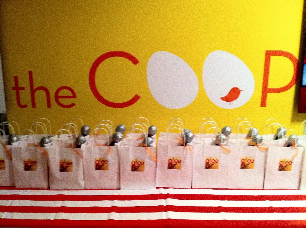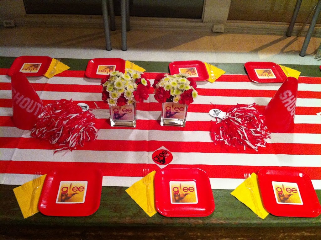 Here is an example of us turning something that has virtually NO party supplies on the market(I am sure they will change that soon!) and making a party out of it. We took the GLEE logo and grabbed the colors for our color scheme — Red, White and Yellow – used the striped tablecloth and did flowers in that color scheme as well. As I mentioned there are no actual party supplies available for this theme — so we made our own! We printed stickers — and placed them on the goodie bags and cake plates to make it “Glee-ie” and used posters on foam core as decor all around the space. The goodie bags included red and white pom poms, glitter microphones and a Glee CD in each. We think it turned out great — it looked modern and clean and still “on theme”! Hope you agree….