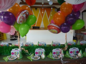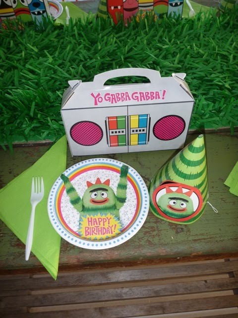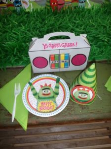 We have gotten a lot of requests for Yo Gabba Gabba parties this year (maybe it has something to do with Brad Pitt as DJ Lance last halloween;) !) The FIRST time we got the request, there were no party supplies available — so I had to download templates to MAKE party bags in the shape of all the characters from their website. Very cute — waaaaaay too time consuming! Finally some party supplies hit the market. As we have mentioned before — sometimes it’s not possible for us to just do a broad modern interpretation on the gift — sometimes we NEED to do the branded stuff. When we do — we still try to keep the look neat and clean… as is evident here (I hope). I love the multicolored balloons — and the bright green paper “grass”runners. It’s a super cheerful, colorful fun party… hope you like!!!