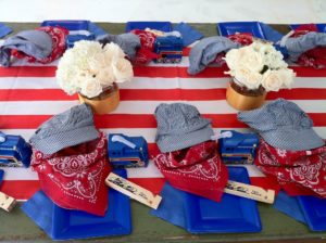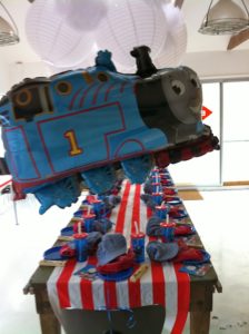 We have had not one, but TWO Thomas the Train parties over the past two weeks — so I think we better post some pics! It is clearly a hot theme right now! We used our fabulous red and white striped tablecloths which add a nice shot of color AND are reminiscent of railroad tracks… which is a cool bonus! As with most of our “branded” parties … we kept the really branded items minimal (balloons, plates, napkins) — and went for a cool train engineer inspired gift…. Engineer cap, wooden train whistle, red bandanna and a Thomas the Train sippy cup. The gift is great because it is gender neutral — which is easier and also lends itself to a more cohesive overall look to the party. Thomas is loved by boys and girls alike — so much so, in fact, that one of our Thomas parties was for a birthday boy, and the other was for a birthday girl!
