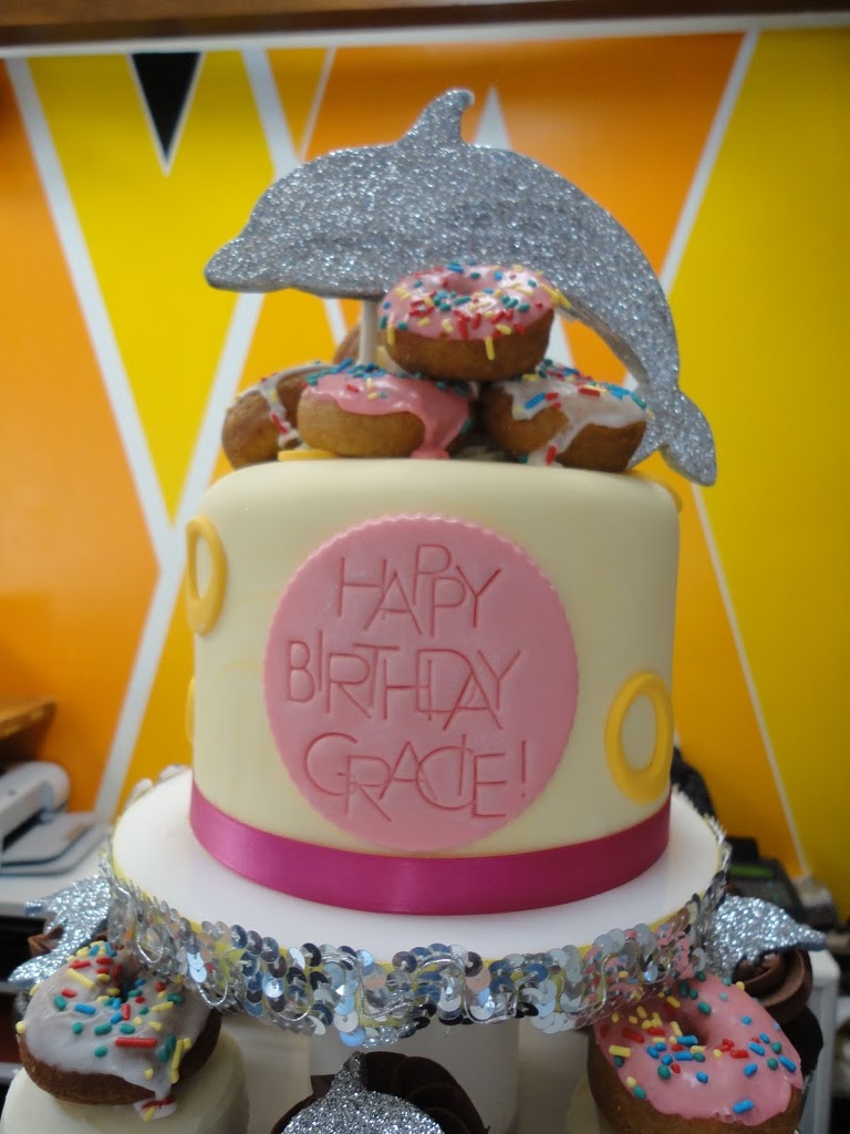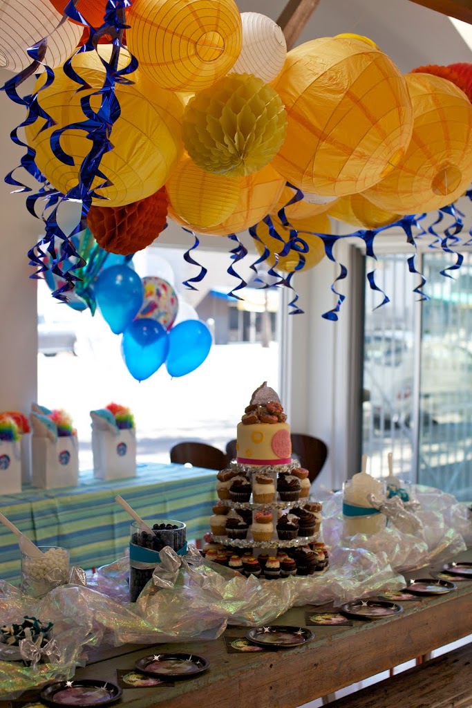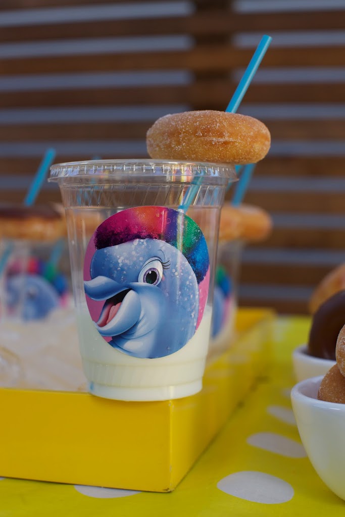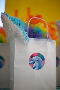 Well…. here at the COOP we pride ourselves on the fact that we can make ANYTHING a theme party! And we think this party is pretty good evidence of that!! Gracie was turning 5…. and she had VERY specific ideas of what kind of party she wanted. So much so, in fact, that when I was at her house one day (she’s the daughter of one of my good friends) she and I were talking about her upcoming BDay — and she was telling me that she wanted a “Dolphin, Donut, Disco” party. Ever the party planner, I immediately started throwing out ideas… “we can do this…. or this — wouldn’t it be cool if we did this?” I kid you not — she looked me dead in the eye and said “When we are on a playdate at YOUR house — we can talk about YOUR ideas…. right now, we are going to talk about MY ideas” I adore her. Thus began the planning for the fabulous Dolphin Donut Disco party you see above! Gracie’s mom had these super cute invites made with the dolphin wearing a rainbow afro wig sitting atop a heap of donuts — and off we went! I grabbed the image of the dolphin off the invite and had stickers made for all the goody bags, We did a really cool opalescent crinklie tablecloth all bunched up down the middle of the main table — which looked like water (very cool)… on which we placed the AMAZING cake created by the insanely talented Julie from Blue Cupcake (she is seriously a goddess when it comes to cakes and cupcakes…. all sweet treats, actually!) and some vases filled with all kinds of candies in shades of white and blue. The goody bags were filled with a plush dolphin, a rainbow disco wig (we tried to make it look like the Dolphin was wearing the wig as he peeked out of the bags), a disco ball necklace and a cool dolphin mobile. We had a Bubble guy come and do a show in the lobby — and then the kids had a free for all bubble fest out in the courtyard area. Super fun! We also filled the bouncer with clear and different shades of blue balloons — as well as some mylar dolphins too! It was great. My absolute favorite element was the milk and donut cups — clear cups with a theme sticker on them, filled with a shot of refreshing milk with a mini Krispy Kreme Donut looped on the straw! So cute … so delicious! Hope you enjoy the pics!