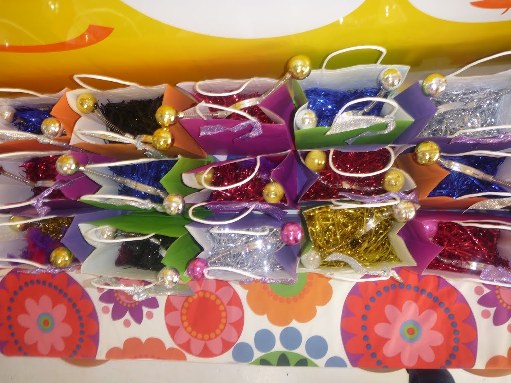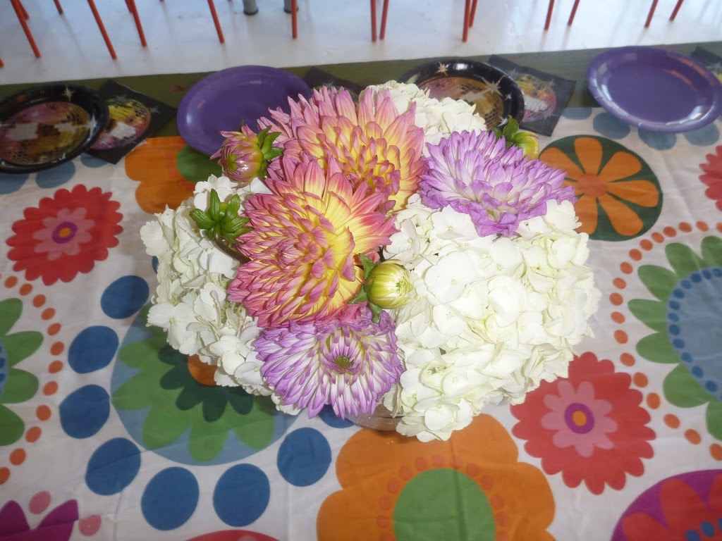 Just a couple of pics of a recent Disco party we did. It was for 2 sisters — so the guest list was huge (bigger than we usually allow actually)…. so we bagged all the goodies right from the get go! Everyone got mylar wigs in an array of colors, disco ball bopper headbands and flashing disco rings. I love the colors of this party — 2 girls meant we could go for the fun funky 70’s bright colors…. which makes for a fun party palette. We used bright colored Dahlia’s and white Hibiscus in glitter ribbon wrapped vases to decorate the space a bit more (since all the goodies were pre bagged!) Pretty Party….