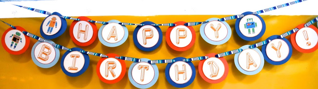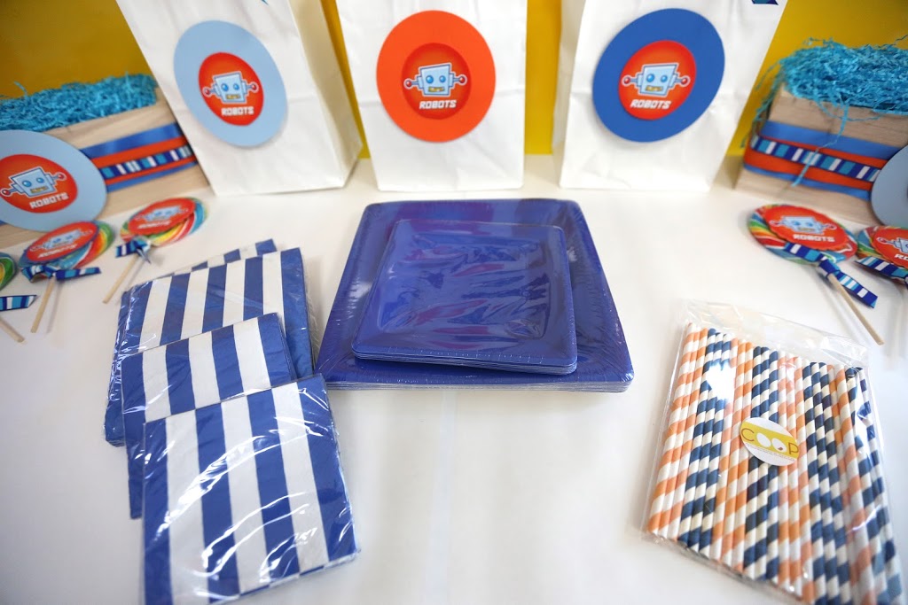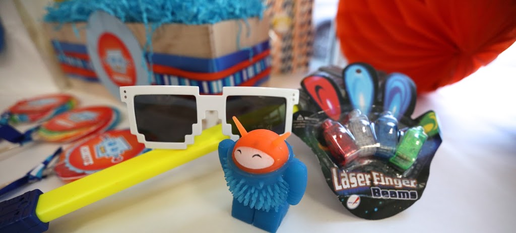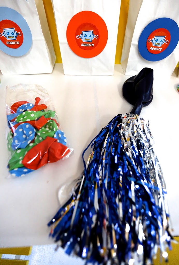 The BASIC CRATE is decorated goodie bags and the party favors for inside the bags (for the ROBOT one above — all the kids got a Robot Arm hand grabber, a hand of laser fingers, cool robo-sunnies and a squishy robot)….