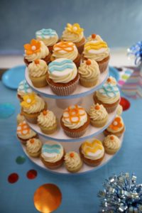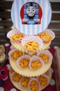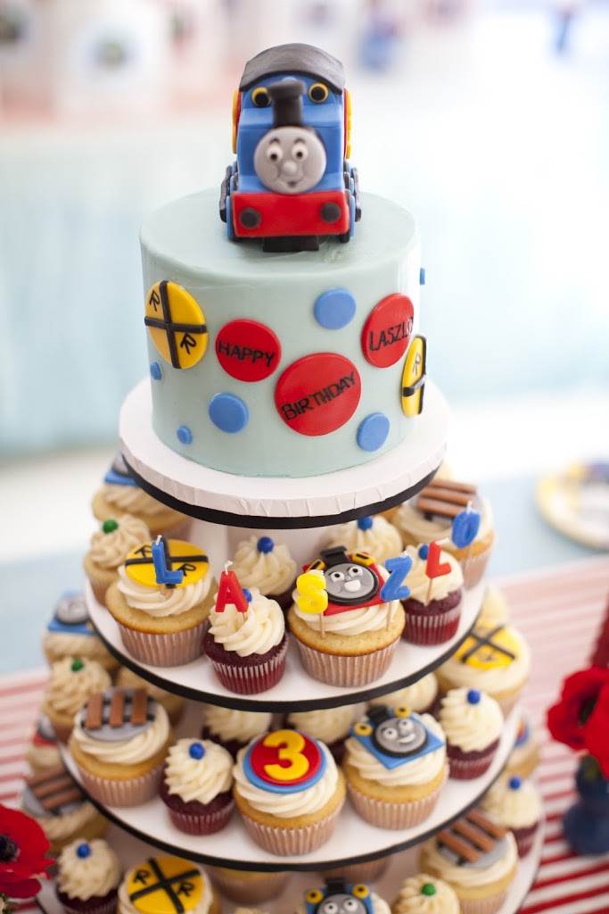 Theses are some cute pics of a THOMAS the TRAIN COOP and CABOODLE party we did recently. Little man Laszlo was saying goodbye to 2 with a CHOO CHOO! Laszlo LOVES Thomas so we went with the branded Thomas goodies on the bags, lolli’s , plates and helium balloons. I love a train party in turquoise and red — so we kept all of our basics — balloons, tablecloths, etc — in that color scheme — and accented it all with the branded goodies… so as not to overload on branded (usually kind of cheesy looking) stuff. We stuck with our cool (unbranded) goodies for the goodie bags — Engineer hats, bandanas, wooden train whistles and train cups for all. The COOP fun is plenty for a party — but Laszlo REALLY wanted a train too… so we brought in a trackless train for the outdoor courtyard area. WE also had a great train conductor face painter/ balloon artist who added to the festivities. Julie at blue cupcakes is responsible for that amaaaaazing cake and cupcake tower… and as usual she did not disappoint! It was a wonderful party with lots of friends and fun! Hope you enjoy the pics.