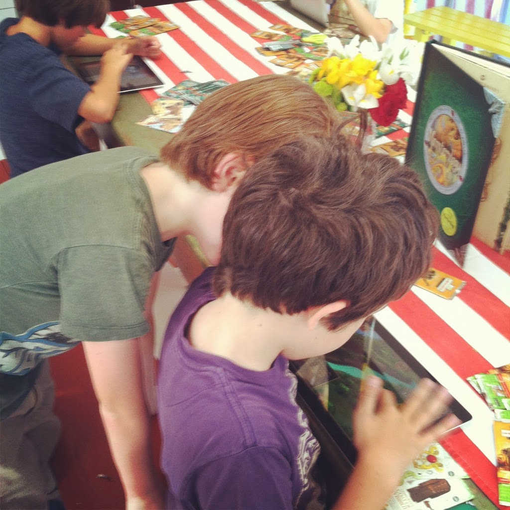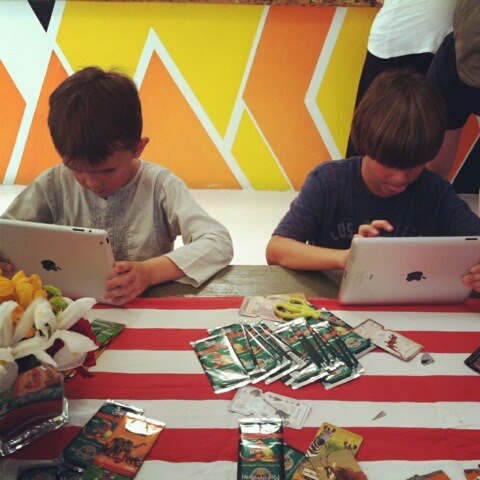 Our own kids — as well as most of the COOP kids we encounter every day — are SUPER tech savvy. They have ahold of iphones and ipads and are digitally fascinated at ages as early as 2! So we were THRILLED to host a launch event for this amazing new company NUKOTOYS a couple of weeks ago. NUKOTOYS magically bring trading cards to life in a very cool interactive format played on your iPad, iphone or ipod touch. The first two games/cards are Monsterology and Animal Planet Wildlands. The games are a free download, and then you purchase collectible trading cards (similar to baseball or Pokemon cards), that actually “magically” (I am sure there is a technical and computer-rific explanation… but my artistic brain does not compute such things — so I am sticking with it being pure unexplainable magic!) appear and interact with the game. You tap the screen of your device with your card and the Monster (in the case of the Monsterology game) or the Animal (the Wildlands game) springs to life IN the game/ ON your screen. It’s so incredibly cool! Our kids were simply fascinated. It’s not often that Lucinda and I see a table full of kids in the front room at the COOP — the room that has NO Ballpit, NO slide, NO dance floor or toys.. the boring/ eating room! But NUKOTOYS came into that front room with their cards and iPads — and the room was swarming with kids the whole party! The kids – aged 2 to 10 — took to the games easily, and just LOVED the interactive element. It was such a fun event for our kids, our COOP, and our friends at NUKOTOYS! Check out video from the event here…