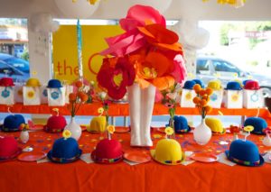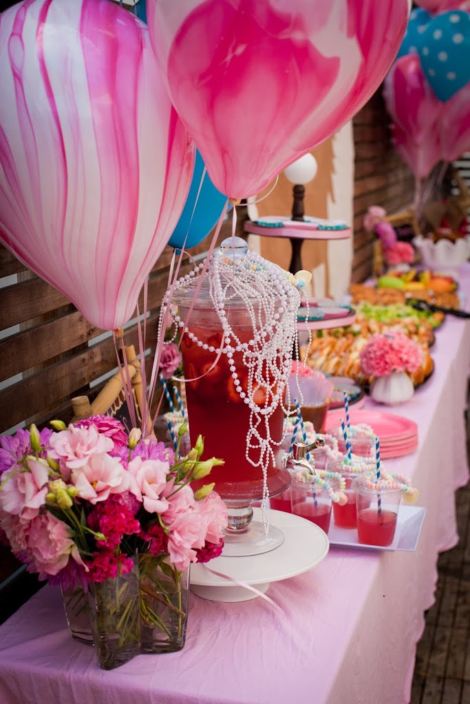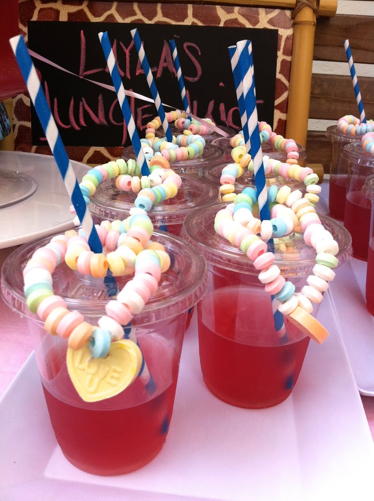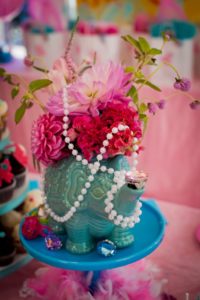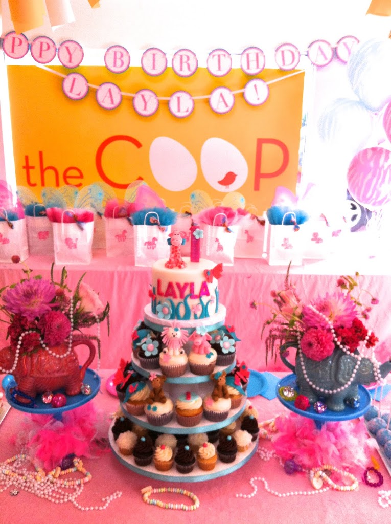 I love when people come to us with an idea — but don’t really have an idea how to make that idea a PARTY! Thats where we come in! Michael and Bridget came to me and wanted to throw a super fabulous bah for their gorgeous little girl. They wanted it to be girlie — but their daughter loved animals. They had seen the party I did for Ashlee Simpson last year — and loved the giant animal paintings — but were worried if they went with a Jungle party… it would be too “boyish”. Mom kept saying her daughter loved animals and the zoo — but she was also super girlie. She loved to dress up and wear her jewelry… and then it hit me…. JEWELRY JUNGLE!!!!! A super girlie Jungle party with loads of girlie elements — as if we caught all the animals playing dress up in the jungle!!! Mom and dad loved the concept and let me run with it. We chose pink and turquoise as the base colors — which was great because I happen to own two elephant teapots in those colors that I used as vessels for the beautiful flowers ( I might have actually have driven the color palate in that direction BECAUSE of those wonderful little teapots!). I also happen to be slightly elephant obsessed — and jewelry obsessed too! — so I was able to bring some of my own necklace wearing burlap elephants marching down to decorate the outdoor table. I draped all kinds of necklaces over the pink lemonade container — and the actual straws on the cups were festooned with candy necklaces. So cute! I am so in love how it all turned out. I love love love to create parties that are more unusual in theme. I mean I love a princess party or a superhero party…. but I really love love a Jewelry Jungle or a Dolphin, Donut, Disco party!! A theme that you’ve never seen or heard before!!! So so fun. Mom and Dad loved it sooooo that they booked one of our very first COOP 2 GO parties for their son Jett!!!