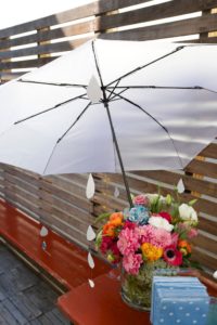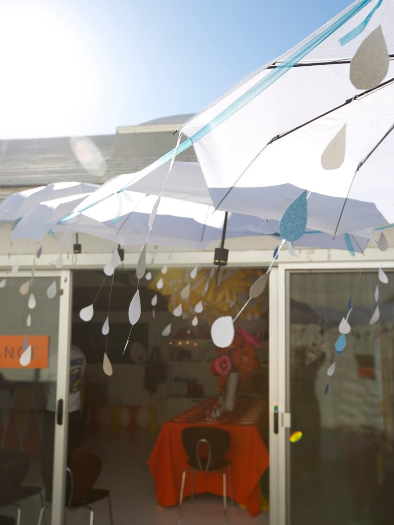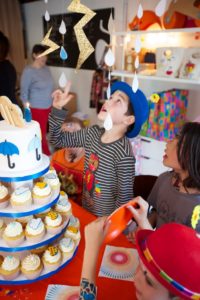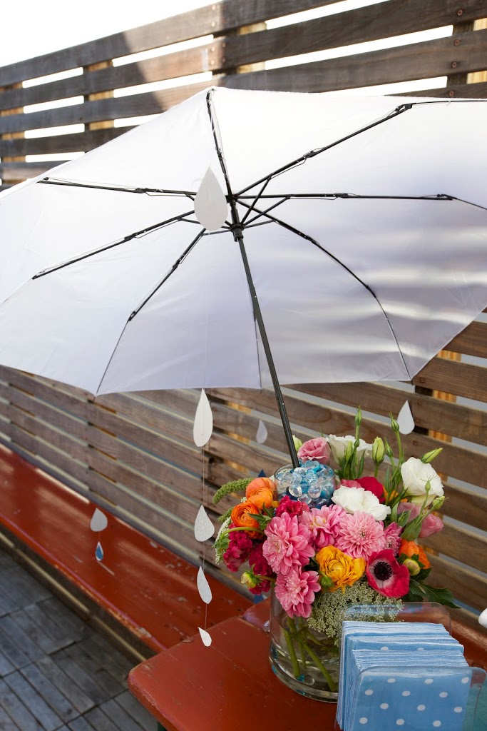 My poor little Grant. I never let that child choose his own party theme! Well — actually now that I just had a baby girl — I may relinquish his parties to him… and next year he can have GI Joe or Minecraft or some other theme that doesn’t inspire me! But for this last birthday of his… I was only pregnant with my little girl — and hadn’t gotten my fill of flowers and frillie things just yet… so he had to deal with yet another beautiful boy party! I forgot just how beautiful this party was — until recently. We had someone come in and help us with some PR and she zeroed right in on an image from this party. She loved it — and it reminded me that I never ever blogged about this one! For shame!! I had made these gorgeous oversized paper flowers for my kids school fundraiser and really wanted to use them again (they are currently in my daughters bedroom… I STILL adore them!). I didn’t know quite how I could use them as the centerpiece for a boy party — till it hit me. He’s an April baby — April Showers,…bring May flowers!! So I ran with a flowers and raindrops theme. I hand made felt clouds that “rained” blue and silver paper raindrops, and put those gorgeous paper flowers in a large ceramic umbrella holder in the shape of rain boots ( I thought that was pretty clever!) But the piece de resistance… was the entryway. I had a trail of white umbrella from the front gate leading to the front door. They were dripping with paper rain and floating in the air… leading you into the flowers inside!!! I love love loved how it looked. The bowler hats with the flowers growing out the top were also a big reason I went with this theme. I have been wanting to incorporate them into a party for years — I just think they are so adorable. So there you have it — Grant’s final girlie party! I can only imagine what I will do for my daughter when her first bday comes along…. Stay tuned!!!