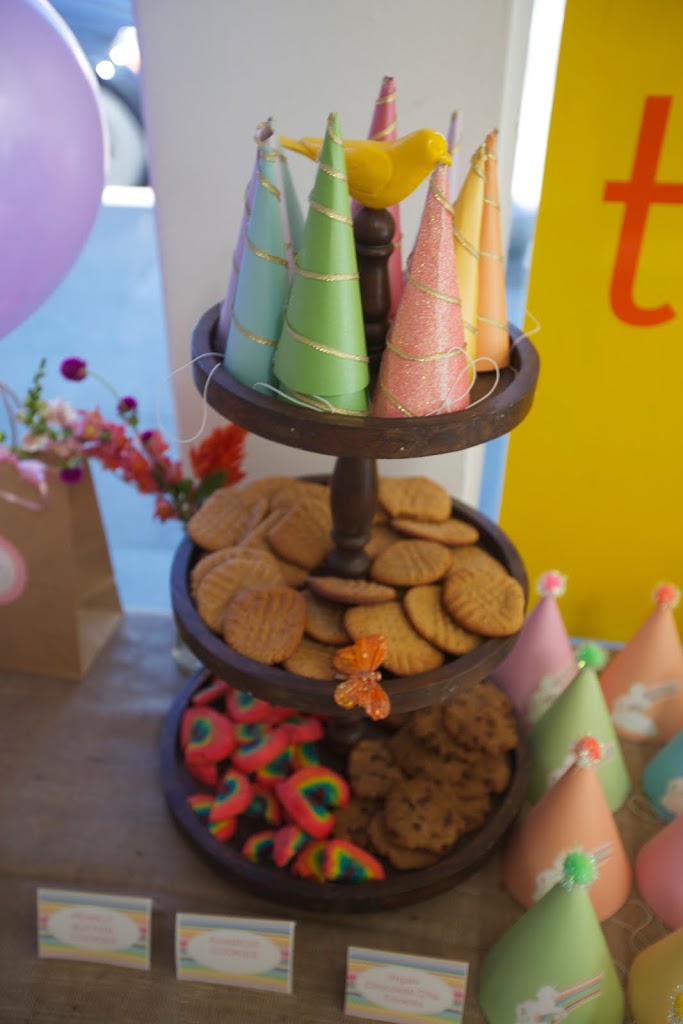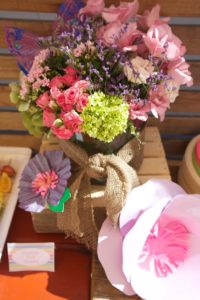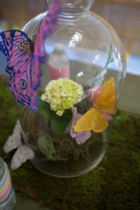 Oh my — this was a fabulous fabulous soiree! The loveliest couple came to us with their concept for their sweet daughters birthday… they wanted to do a magical enchanted forest theme. I was so excited at the idea — they wanted to keep everything woodsy and have me do fabulous flowers in a variety of light rainbow colors to match all the fabulous printables they bought for the party. I used our mossy grass runners and all our wood elements… platters, 3 tier tray, nests, wooden and golden mushrooms and butterflies galore. In addition to the mass of fresh flowers, I also used some of the large and small paper flowers I made in lavender and pink hues. So pretty. I also made a beautiful light creme burlap and gold glitter Happy Birthday Banner that we hung outside over the food table. And how about those balloons? They matched his printables PERFECTLY!! I couldn’t believe how perfectly the colors matched! The goodie bags were packed with Rainbow tutus (another perfect match!), wands and butterfly wings for the girls and Merlin hats and wands and black capes for the magical boys! One of the dads handmade all the cookies and cakes which were absolutely divine… and looked spectacular in the magical world we had created. It was really a beautiful beautiful day for a lucky little girl whose dads sure know how to spoil a lady!!